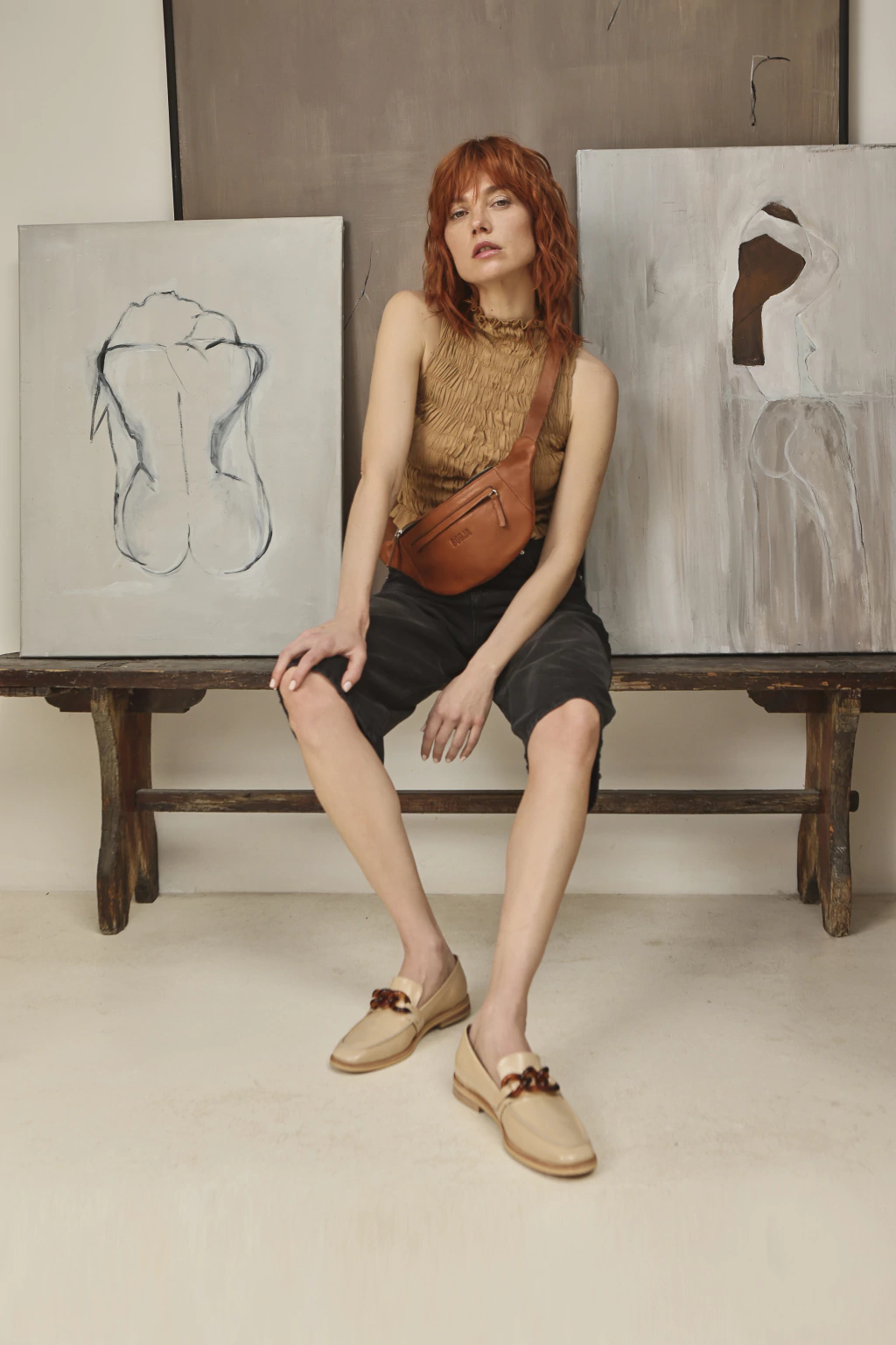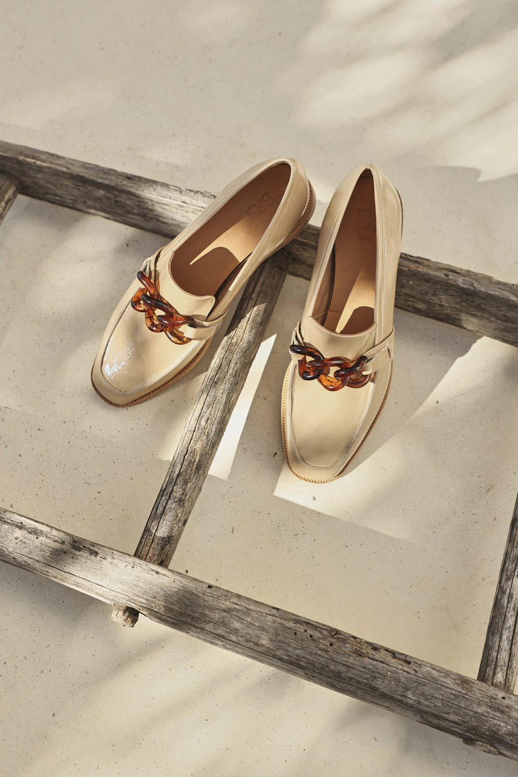Mocasín en cuero charol quebrado camel. Un modelos atemporal con cadena simil Carey.